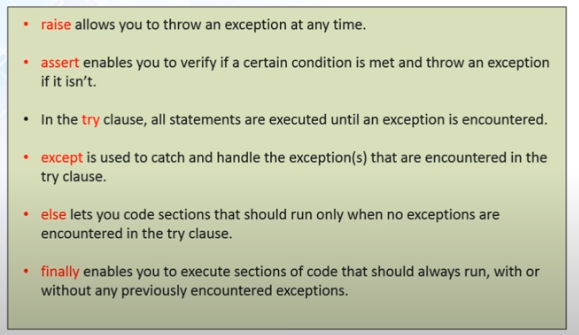 ⇒ Exception : occur syntactically correct code run into error, for default cases, python highlights the type of exception the code is having like ‘ZeroDivisionError’